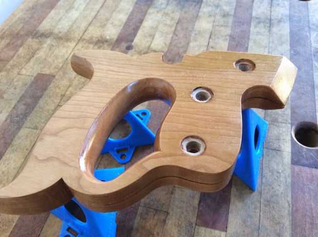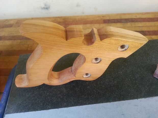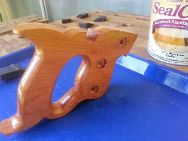 Comencé con una capa de wash de goma laca. Esto me permitió ver a cualquier lugar que sea necesario lijar más y también trajo hacia fuera la riqueza de la cereza. Después de lijado final, apliqué TruOil lijado ligeramente con lija 320 entre capa y capa. TruOil mejor se aplica en capas finas y se seca duro. Es ideal para los mangos de la sierra y se ve muy bien. El lijado en los pasos anteriores realmente vale la pena aquí.
