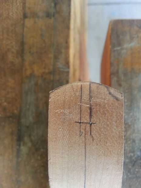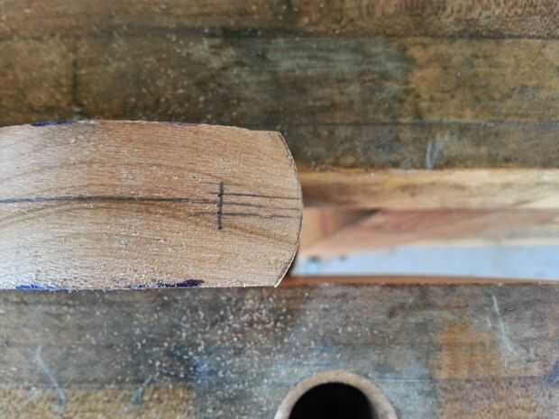 Para lograr el look que quería yo marcado la línea central y luego un pequeño desplazamiento a ambos lados. He utilizado una brújula y calcula el radio que se veía bien a mis ojos y luego trazó una línea perpendicular para dar mi punto de mira para colocar el punto de mi brújula. Este método de compensación te da un radio más amplio en lugar de un semicírculo perfecto. Creo que se ajusta el mango mejor.