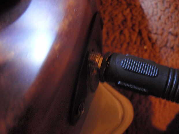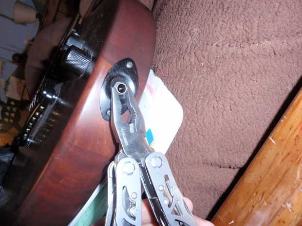 He tenido esto me sucede dos veces, así que estoy suponiendo probablemente ha sucedido a usted. La tuerca que sostiene al jack de entrada de mi guitarra eléctrica ha aflojado y entonces caído. El gato sí mismo se empuja en el cuerpo, y estás enojado. Para obtener a la toma fija, retire la cubierta de gato que se atornilla en la guitarra. Agarre al enchufe con alicates de punta delgada, pase por el agujero de la tapa y tornillo nuevo. Deslice la tuerca del real con el cable que se conecta a la guitarra. Luego, sujete al conector con unos alicates y conecte el cable. Deslice hacia abajo la tuerca y el tornillo que lo suficiente que no caer en el cuerpo de la guitarra. Luego retire la pinza y jack y apretar el resto del camino con una llave. No la apriete demasiado, y lo mismo ocurre con los tornillos.