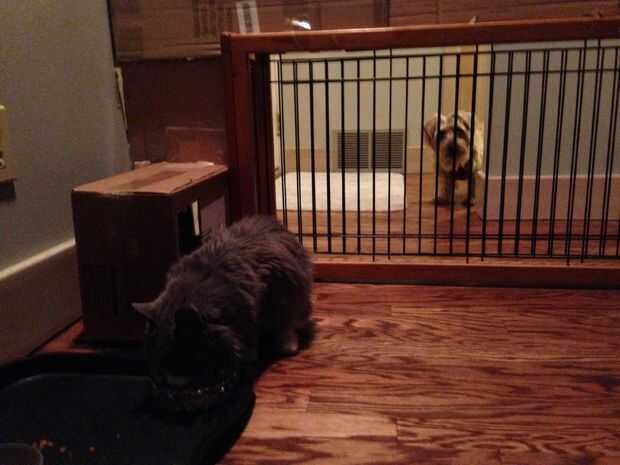 Es un problema simple. Tenemos un gato geriátrico que apenas come y dos Terriers de Norfolk que aman la comida para gatos. Da la espalda por un minuto y los perros se buscan la comida para gatos y lo de la bufanda. Los perros montar un espectáculo de ser lo siento si les pillamos, pero tan pronto como tienen otra oportunidad, van para él otra vez. Hemos intentado levantar la comida mientras que los perros estaban hacia fuera, pero siempre nos olvidamos, metió otra vez. Ponemos encima de una puerta comprada, razonamiento que podría saltar el gato y los perros no podían, y funcionaba a veces. Nuestro perro Bert consiguió bastante bien en lo de salto y comenzó a orinar en los platos de comida de gato una vez que él había limpiado hacia fuera. Claramente necesitábamos hablar con ese perro.