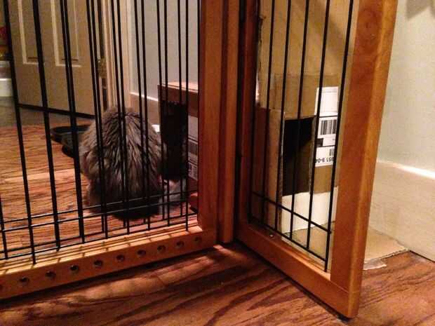 Fue y cogió un plato de salmón, poner detrás de la pared y el gato frente a él. Ella no llegar bien bien lejos, así que le había situado en frente del agujero y le dio un empujón. Subió a través de, había encontrado el pez y había averiguado el arreglo muy rápidamente de allí. Ella va y muchas veces al día va a su caja de arena y su comida, y los perros, hasta ahora al menos, no.
