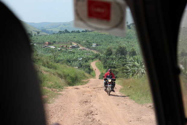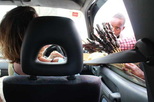 La primera parte del viaje a Mbarara no estuvo mal. Los caminos eran sobre como más en los Estados Unidos. Después de Mbarara, se puso mucho peor. Se convirtió en una simple pista de pavimento llenado de baches y grandes camiones va ambas maneras a altas velocidades. Comenzó a nublarse y la lluvia comenzó a caer. Hijo de Paola le grita hacia fuera, ¡ mamá mira hacia fuera! en un camión que viene a nosotros con intención de pasar. Paola viraje sobre el lado y empezar a gritar palabrotas en inglés e italiano. El entorno era increíble pero era difícil tomar sus ojos fuera de la carretera. Nos tiraron encima en un pequeño pueblo y el coche pululaban hombres llevar palillos de carne, refrescos y botellas de agua y los plátanos asados. Ellos fueron empujones lo en la ventana, gritando hacia fuera los precios. Cada uno de nosotros agarró un palo con un trozo de pollo a la parrilla y continua bajando por la carretera con las manos grasosas y arrojar los huesos hacia fuera la ventana.
