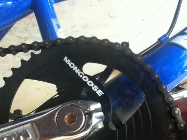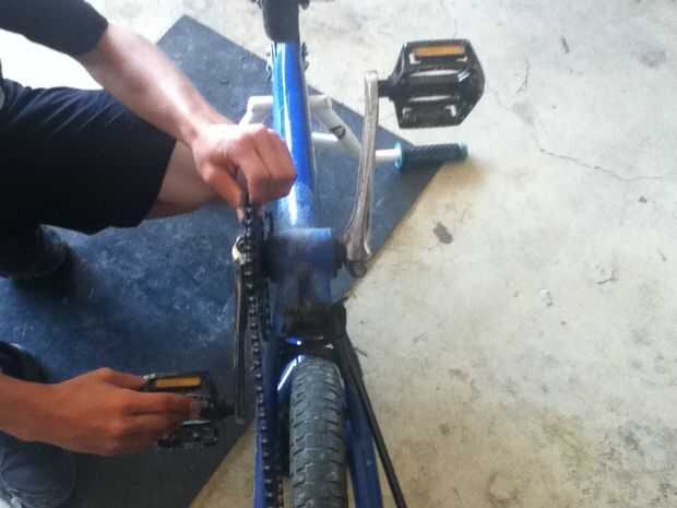 Empezar poniendo la cadena en el pequeño engranaje en el eje trasero de la moto. A continuación, coloque algunos de la cadena en el alrededor de la gran marcha por los pedales en el lado hacia el asiento. (Este lado debe estar mirando hacia abajo ya que la moto está al revés.) Manteniendo una mano sobre la cadena para guiarla, poco a poco empezar a pedalear la bicicleta. Completamente este debe colocar la cadena en ambos engranajes.