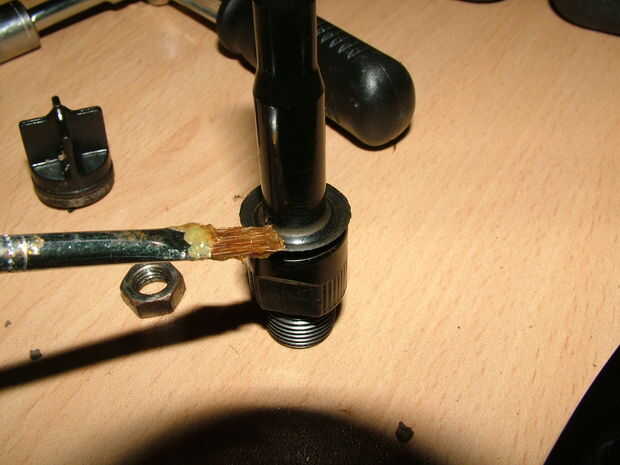 Tome su cepillo de la última etapa y limpiar en el paño, prepárate tu grasa y sumerja el cepillo en ella, luego aplicar un montón de grasa a ambas tazas cojinete dentro del cuerpo del pedal. Utilizar un montón de grasa aquí ya que es lo que asiente los cojinetes. Entonces reemplace el sello del cojinete en el eje de la última etapa y engrasar la Junta y el cono en el eje y engrasar el cono y la rosca en el otro extremo del eje.