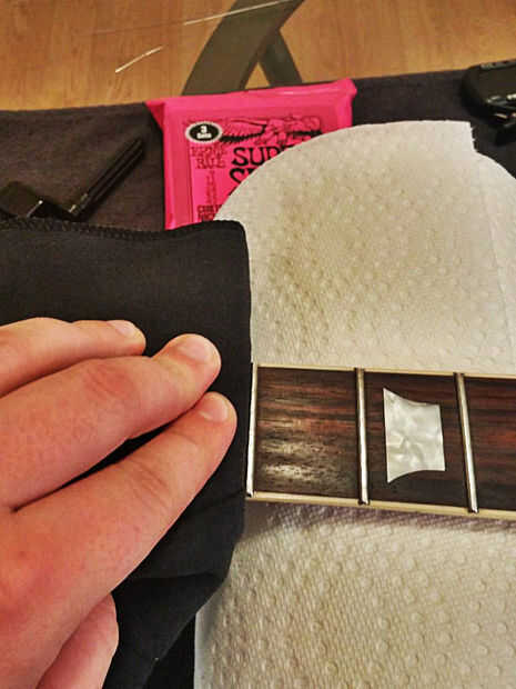 - Con las cuerdas quitadas totalmente agarra su microfibra paño de limpieza y comenzar en el primer traste.