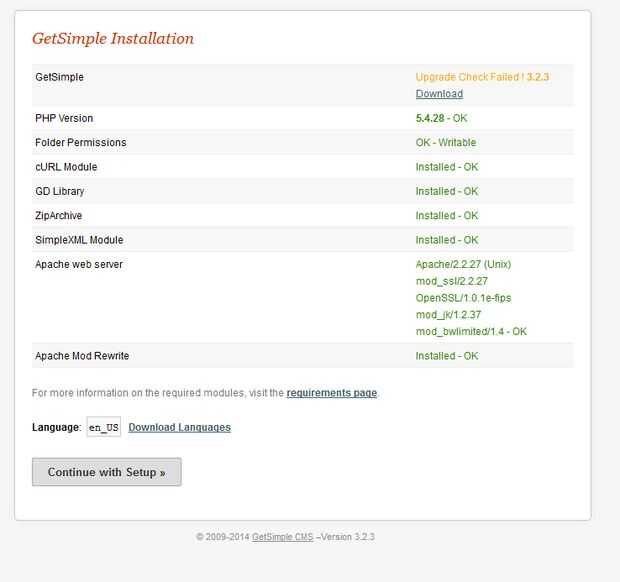 Obtendrá la pantalla de instalación que mostrará la información del sistema que va a usar el get-simple. Aquí todo se muestra en verde como todo cumple con la plantilla.