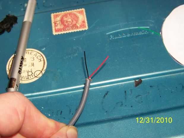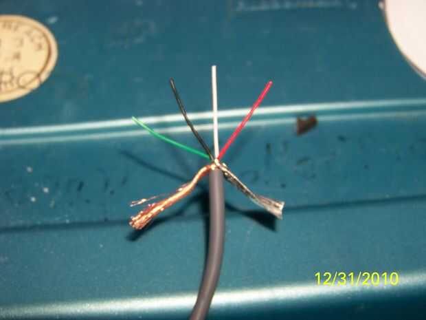 Corte el alambre y luego con cuidado separar los alambres individuales. Una vez separados tienes 4 cables (rojo, verde, negro y blanco), un protector de la hoja y luego un alambre de cobre escudo. Estaremos trabajando con los cables rojo y negro que son la tierra y la positiva de 12 voltios. Recorte todo lo demás corta y fuera del camino.