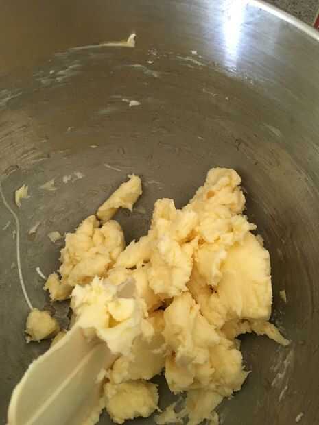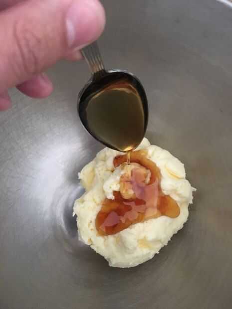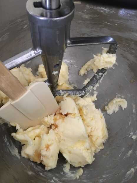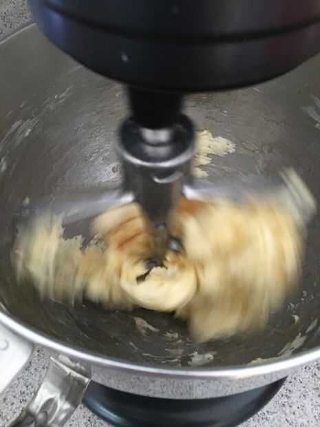 Vuelva a encender su mezclador bajo y dejar que la miel doblar en la mantequilla, asegúrese de parar cada minuto o así para sacar la mantequilla fuera de la batidora que utilizas.