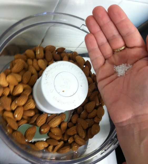 Nota: no recomiendo usar más de 3 y 1/2 tazas, a menos que tenga un procesador de alimentos realmente grandes.  Su máquina podría no ser capaz de manejar la cantidad de tiempo necesario para convertir tanto almendras en mantequilla de almendra.