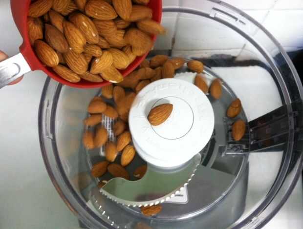 1. Añadir 3 tazas de almendras crudas a procesador de alimentos