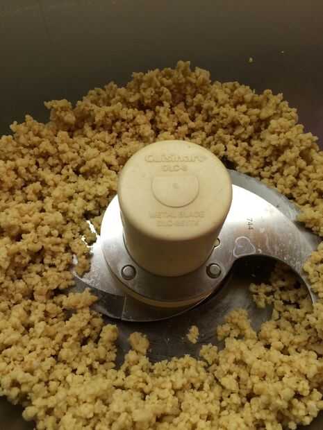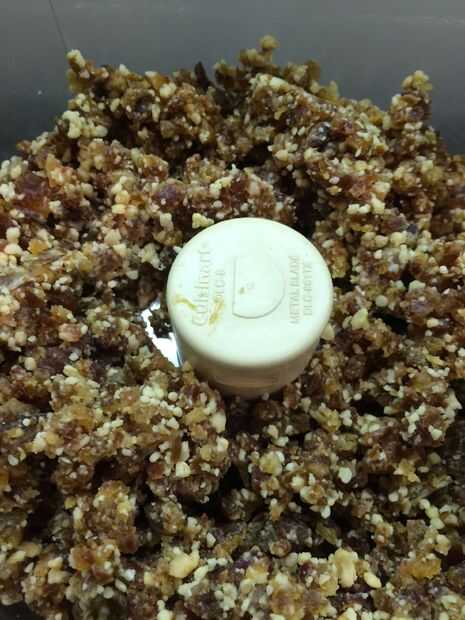Añadir los cacahuetes a la procesadora de alimentos y el pulso hasta que quede grumosa como en la imagen. Ahora añadir las fechas y los chips de chocolate y mezclar hasta que esté pastosa, como en el cuadro 3.