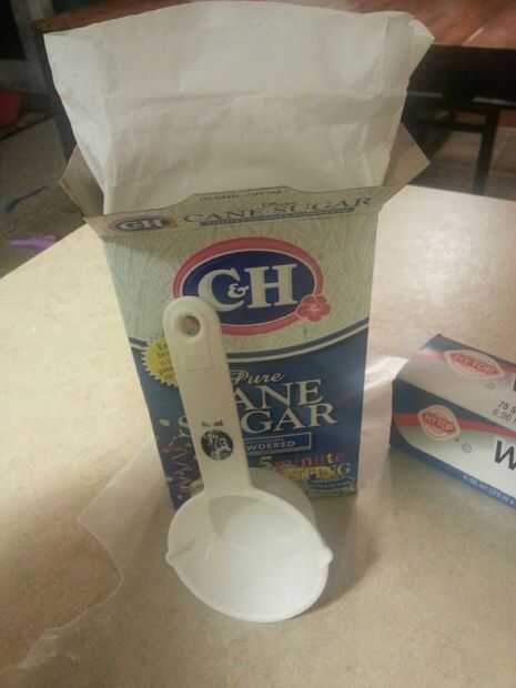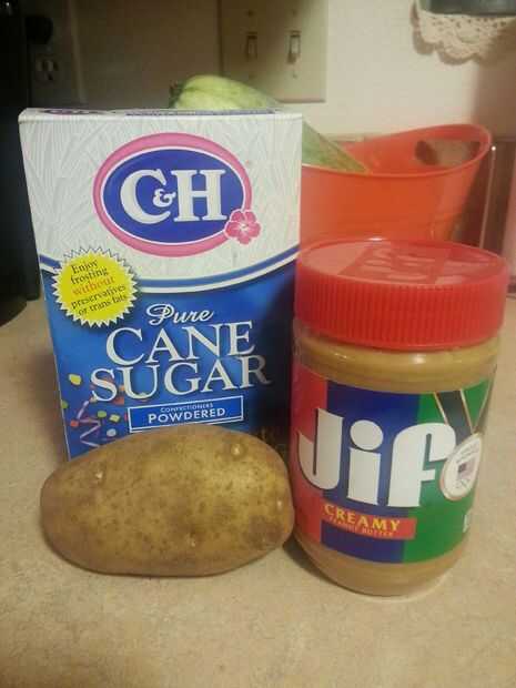 Sólo tres ingredientes: una patata pequeña, azúcar en polvo y mantequilla de maní. Utensilios: tenedor, pluma, papel de cera, un recipiente pequeño, microondas, cuchara, placa, cuchillo de mantequilla, 1/3 taza, horno mitón/agarradera del balanceo.