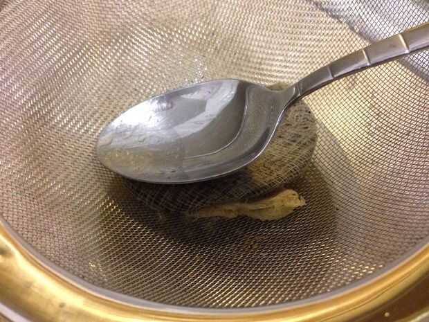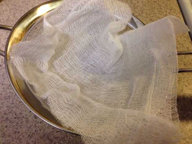 Para ello, simplemente pone un cuadrado de tela sobre el colador. Asegure los lados con una mano mientras lo vierte la mezcla sobre la estopilla. La manteca caliente y el agua pasará a través de la tela y la malla, dejando atrás un montón mantecoso de sólidos húmedos. Use una cuchara para exprimir los líquidos restantes, y usted debe terminar con un plato de butterwater de color marrón verdoso.