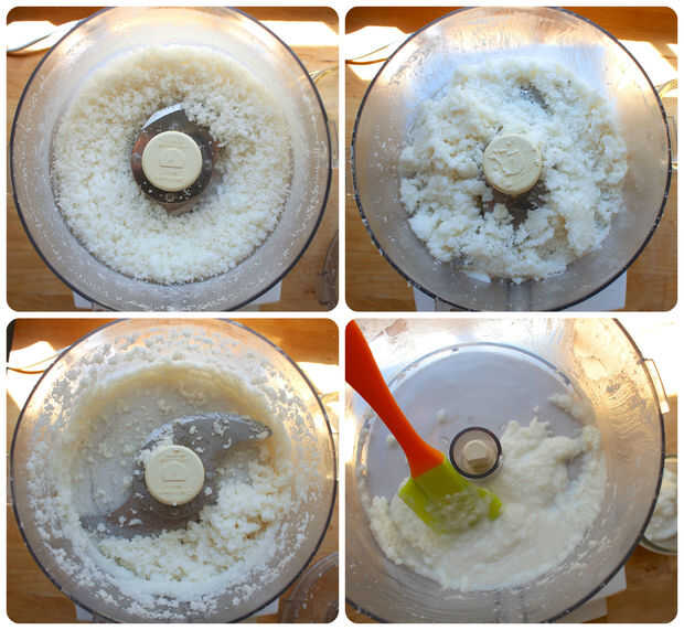 A procesamiento y raspando hacia abajo cada minuto más o menos hasta que se alcance la consistencia deseada. Primero te haz picado encima y esponjosa, luego a empezar a romper hacia abajo y agrupando y al final va a ser bastante suave. :)