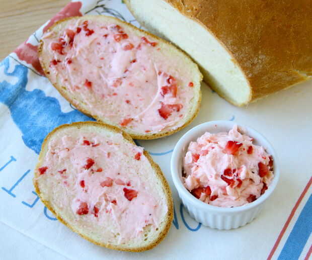 ingredientes:1 taza de mantequilla salada (a temperatura ambiente)1 taza de fresas picadas (cortadas los tallos antes de medir en Copa)Miel de 3 TBInstrucciones:Mezclar todos los ingredientes en el procesador de alimentos hasta completamente lisa. T