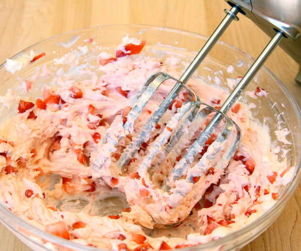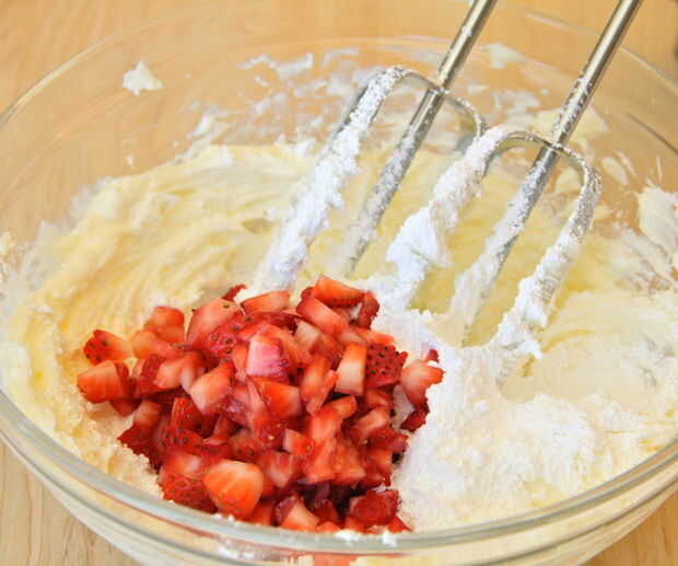Me gusta mantener la mezcla en la fresas se rompe un poco más abajo y la mantequilla se vuelve agradable y rosa. Asegúrese de que está raspando los lados hacia abajo de vez en cuando!