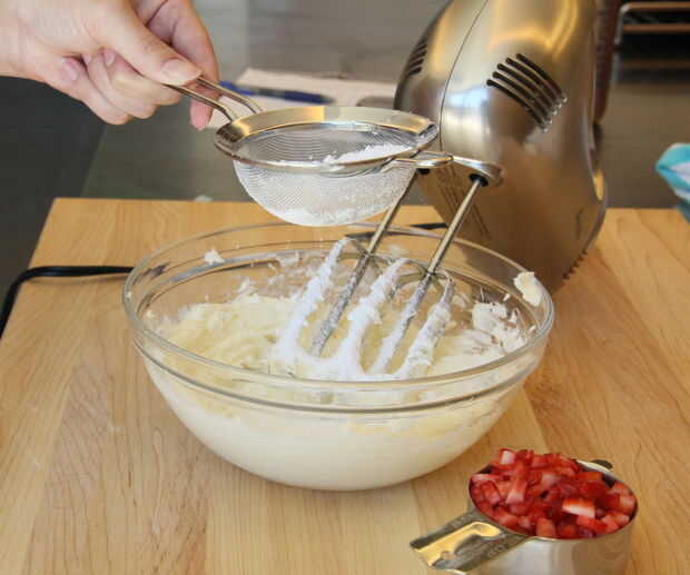 Una vez que las fresas son preparadas, poner la mantequilla en un bol y mezclan hasta que esté cremosa. Luego verter 1/4 de taza de azúcar glas en un colador y agitarlo en la mantequilla. Añadir las fresas picadas y luego mezclar bien!