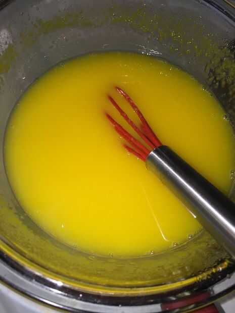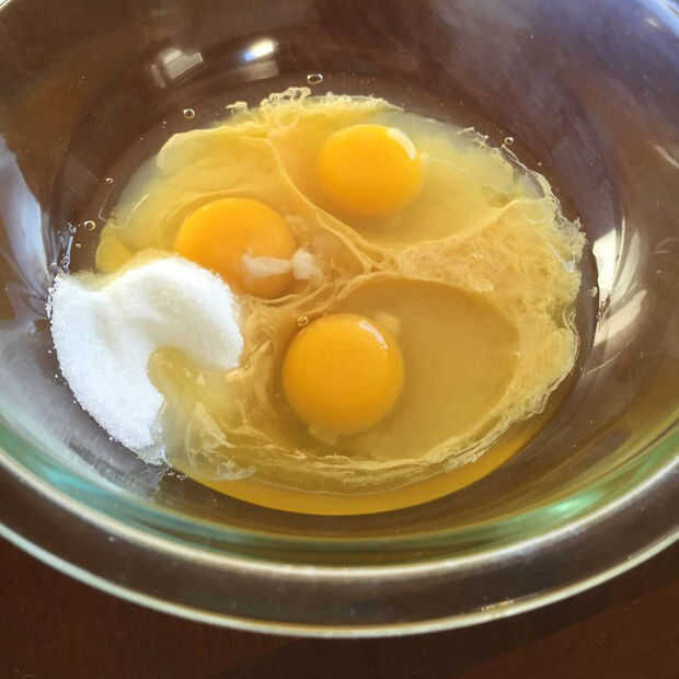 Primero se vierte los huevos, el azúcar y el jugo en un recipiente de vidrio y batir hasta combinar.