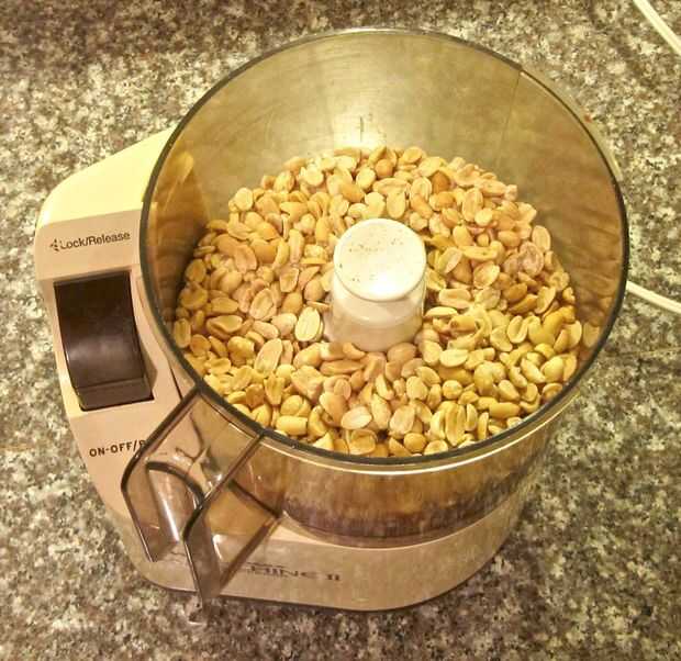 Añadir el maní a la procesadora de alimentos. Comenzar a pulir! Empezar por moler el maní en intervalos de un minuto.