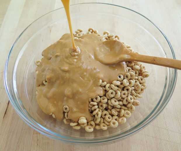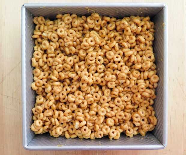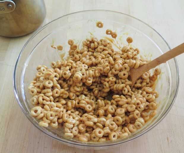 Tan pronto como está fundido, mezclarlo con su Cheerios y cuando que se mezcla, ponerlo en la sartén. No te entretengas, es todo muy pegajoso.