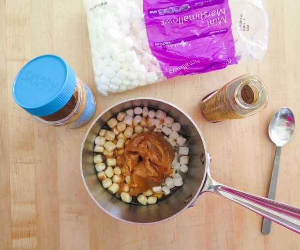 Mezcla tus malvaviscos, mantequilla de maní y miel en la cacerola.