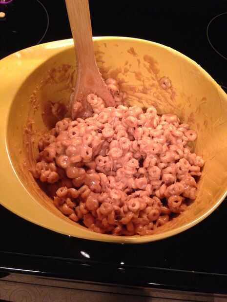 Mientras que la mezcla esté caliente, agregue 5 tazas de Cheerios. Asegúrese de que las Cheerios son totalmente recubiertos con la mezcla de mantequilla de maní.