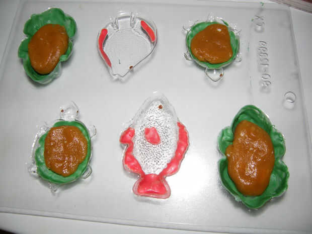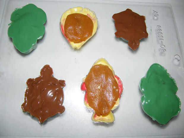 Derretir el chocolate se derrite, pintar ligeramente su molde chocolate, congelar durante 5 minutos, sacar, poner bolas de chocolate en el centro luego vierta chocolate para cubrirla. Congelar nuevamente por 10-15 minutos