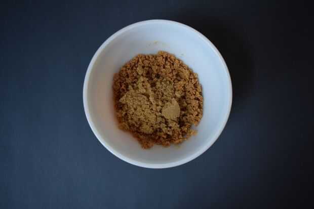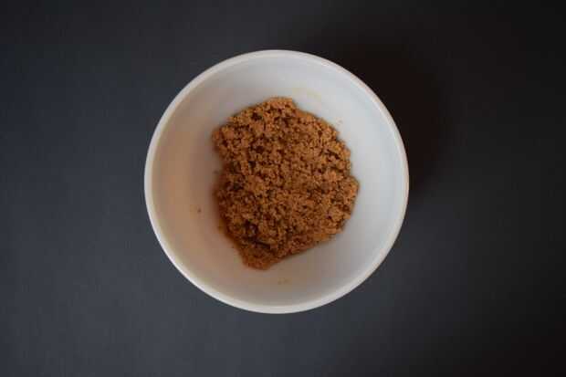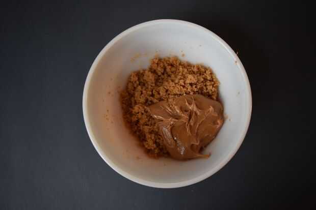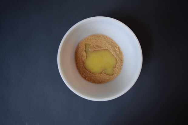 2. Mezcle 1/4 taza de mantequilla derretida con la 1/2 taza de migas de galleta en un tazón mediano.