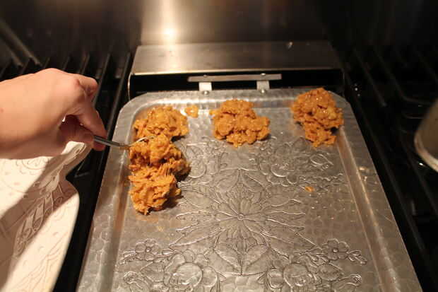 Caída de cokies tamaño de pelota de golf en un plato, dejar enfriar durante 8 a 10 minutos! Por último, disfrutar de su increíble Cookies Cornflake de mantequilla de maní!