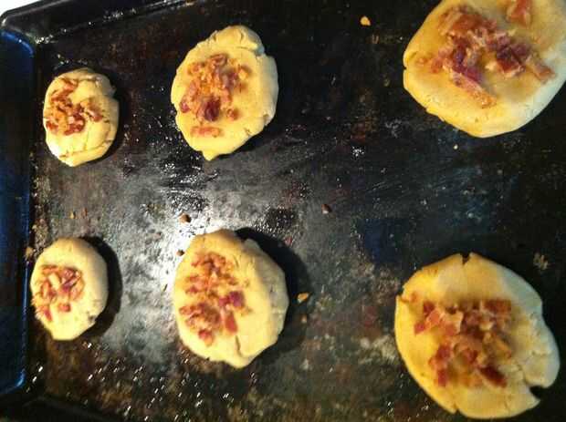 Luego tomar un pequeño puñado de masa para galletas y aplanar un poco en la bandeja para hornear.