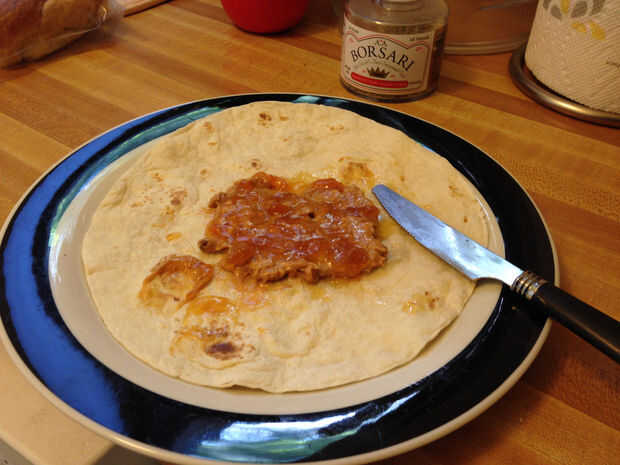 La mantequilla de maní en el centro de una tortilla ahora caliente de propagación, propagación de la jalea de eso.