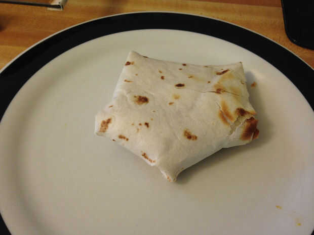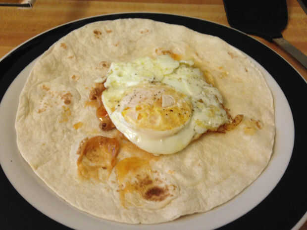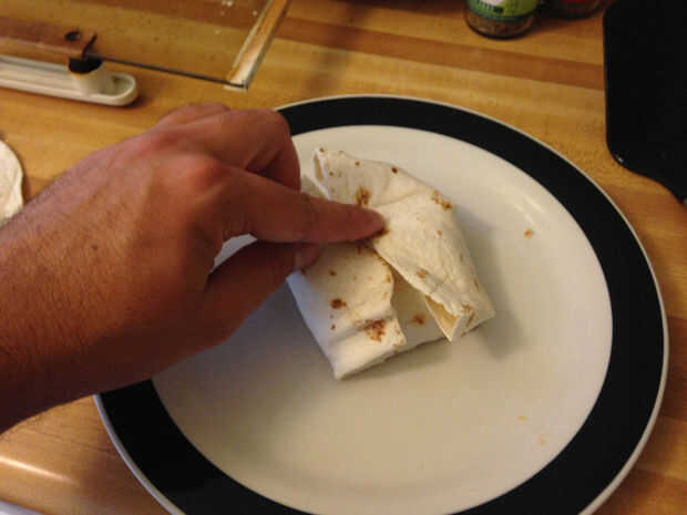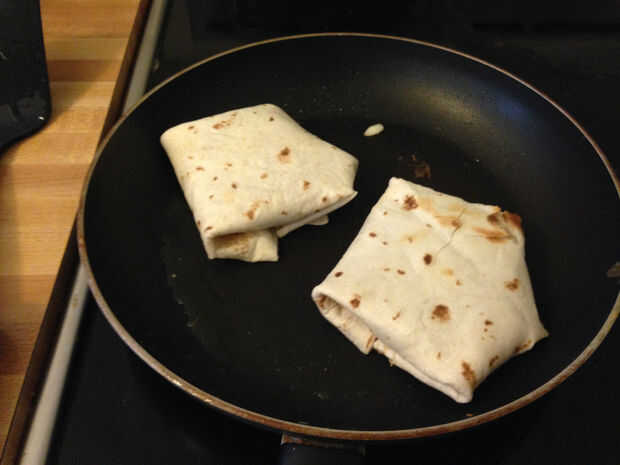 Coloque el huevo fácil en capas PBJ, doblar en un Pentágono y cocer un poco más a crujiente el doblez de la envoltura.