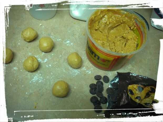 Mezclar la mantequilla de maní y azúcar glas al gusto. En serio, no puedo darle una cantidad exacta, porque todo el mundo le gusta una diferente cantidad de dulzura. Usé mantequilla de maní chunky, pero puedes usar naturales o ya endulzado o hey, por qué mantequilla de almendras no! Agregue suficiente azúcar a la mantequilla de cacahuete que se convierte en una especie de masa. Tiene que ser capaz de ser enrollado en bolitas sobre una cucharada de cada uno. Si pones en exceso azúcar glas, se quebrará, pero muy poca azúcar glas y la mantequilla de cacahuete se pegan en las manos.