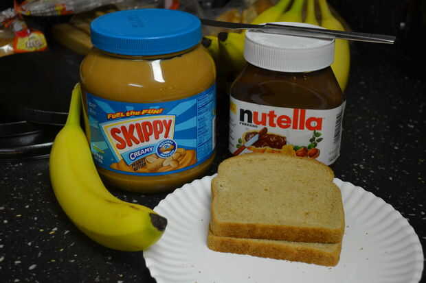 los materiales que usted necesitará son un tarro de mantequilla de maní, una toalla de papel, tarro de nutella, un cuchillo de mantequilla y dos pedazos de pan. como tostar el pan necesita una tostadora#ferociousdoughnutsPaso 1: crema de cacahuate to