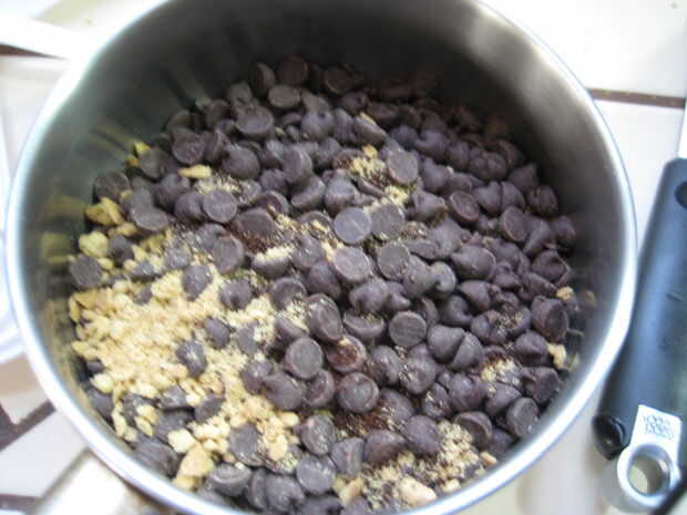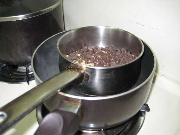 3. Coloque la cacerola pequeña sobre la cacerola (Asegúrese de que el agua no es suficientemente alto como para tocar la bandeja más pequeña) una espera para el chocolate derretir