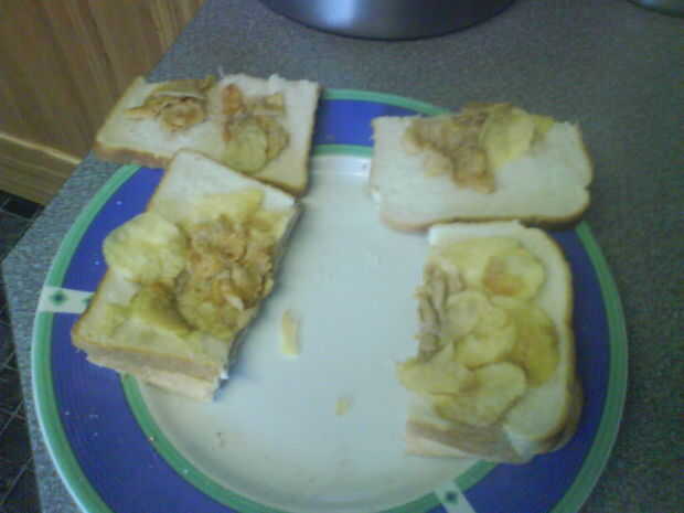 Poner el bit 3 de pan sobre la parte superior, presione con firmeza para garantizar los crujientes para el 2 º bit de pan, cortar por la mitad y disfrutar
