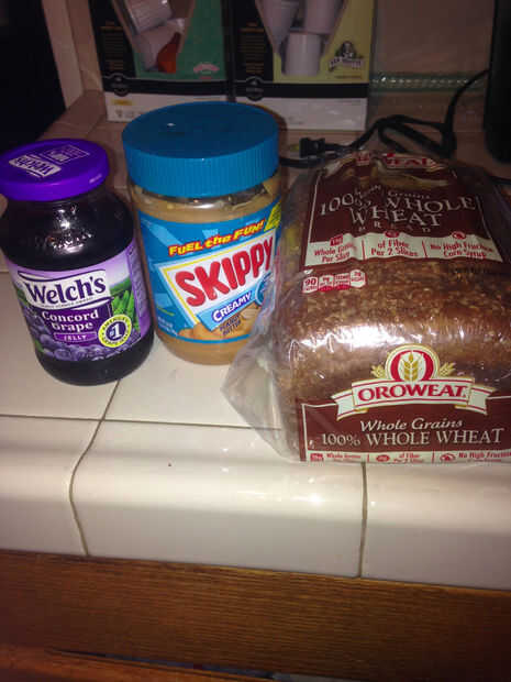 Así que para su primer ingrediente, va a necesitar pan. Para este proyecto que decidí utilizar pan de trigo porque es más saludable, pero usted puede eligió cualquier tipo de pan te gusta. Luego, vas a necesitar mantequilla de maní. Entonces, algunos jalea. Opté por usar jalea de uva, suelen utilizar la fresa, pero para este proyecto todo lo que tenía era uva. Por último, un cuchillo (no se muestra en la imagen) para extender la mantequilla de maní y jalea.