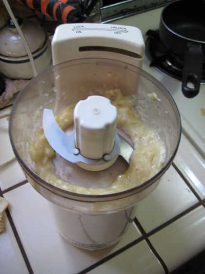 Colocar banana en procesador de alimentos y puré de fondo. Si no tienes un procesador de alimentos, puede aplastar el plátano en un tazón con un tenedor. Asegúrese de salir tantos trozos como sea posible, si este es el método que utilice.