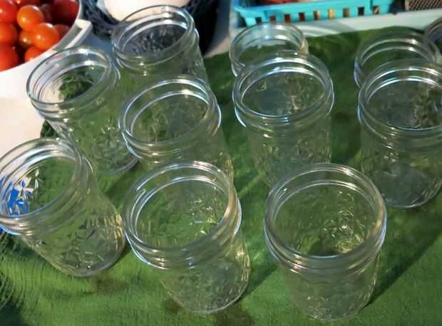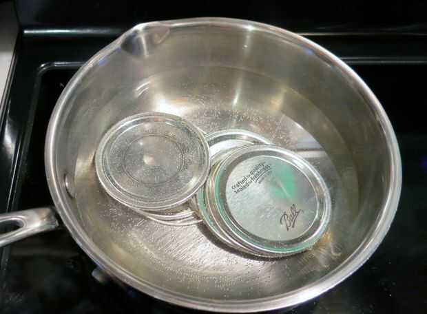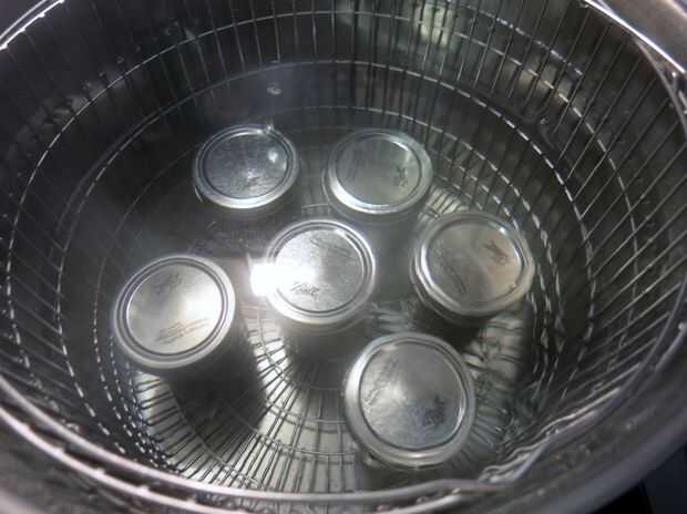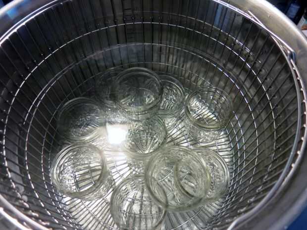 En primer lugar, esterilizar tus frascos, bien hirviéndolos en una olla grande y profunda de agua (que debe cubrir los frascos completamente) durante 10 minutos o lavarlos en un montón de agua caliente con jabón, enjuagar y secar bien las piezas y luego coloque los frascos en un horno de 200 grados durante 20 minutos. (Hervimos en la olla grande en que puede, esto asegura que el agua es agradable y caliente cuando estoy listo puede). Calentar las tapas en una olla pequeña a fuego medio bajo (no hervir.)