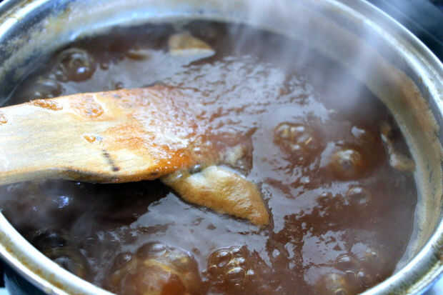 El objetivo es cocinar casi todo de la humedad, mientras que simultáneamente caramelizar los azúcares. Buscas casi 200 grados en un termómetro. Si saca una cucharada y blob en un plato frío, el agua no debería separar rápidamente de ella y caer lejos.