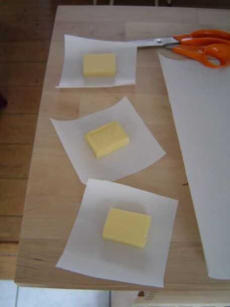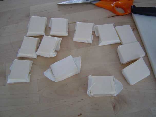 Trabajar con rapidez y no manejar la mantequilla demasiado - ya que es ahora en pequeños pedazos se ablandan muy fácilmente. Ponga cada pedazo de mantequilla en el centro de un cuadrado de papel, envuelva el papel alrededor longitudinalmente y doblar los extremos. He intentado envolver unos cuantos así que los extremos eran triangulares, que es lindo, pero no funciona así (el papel es demasiado elástico).