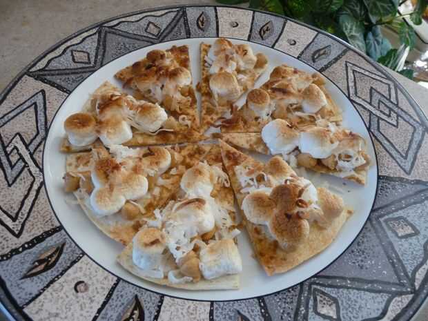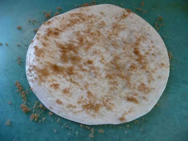 Rocíe ambos lados de la tortilla de harina con aceite y espolvorear con azúcar moreno. Cortar la Tortilla en 8 cuñas. Coloque en una bandeja y hornear durante 8-10 minutos, entregar las fichas a la mitad el tiempo de cocción.