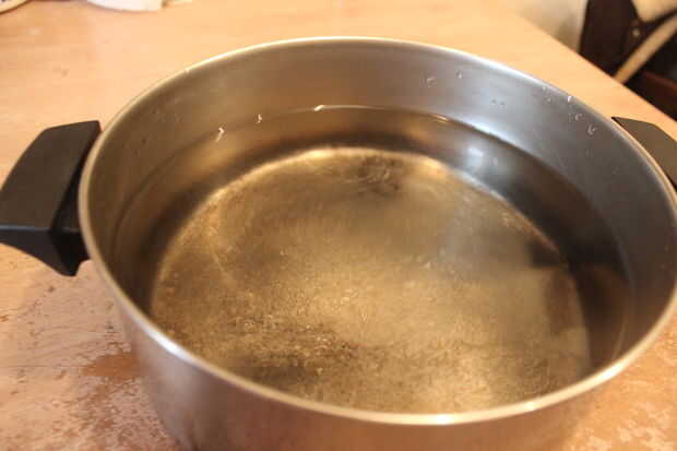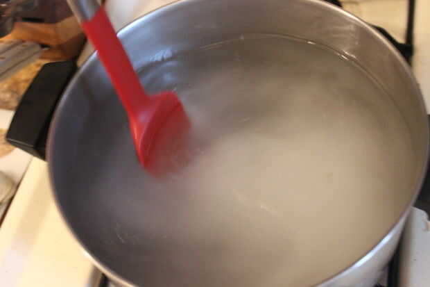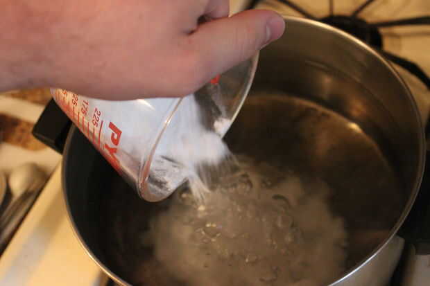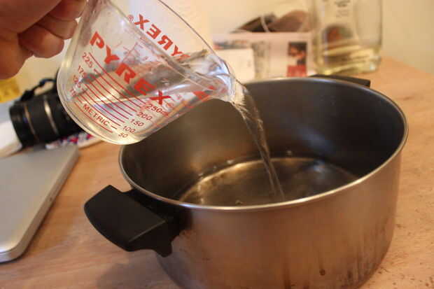 Esperando la masa suba salir una olla mediana. Medir y agregar 10 tazas de agua a la olla mediana. También medida hacia fuera 2/3 taza de bicarbonato de sodio pero no añadir aún a la olla de agua, solo ponerlo a un lado por ahora.