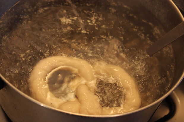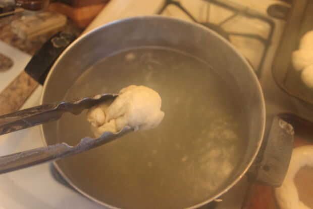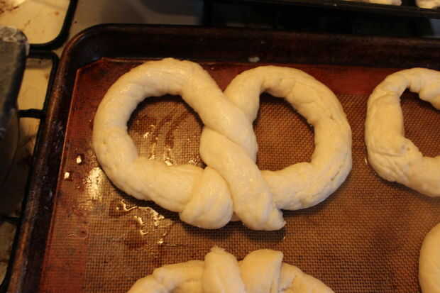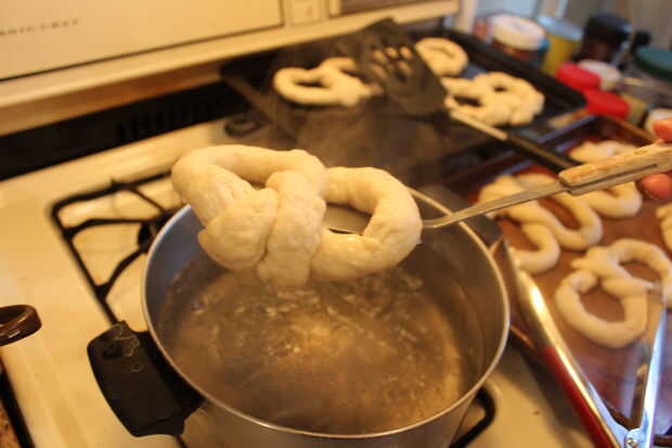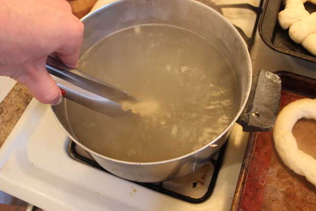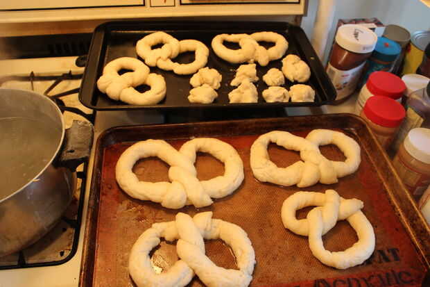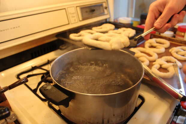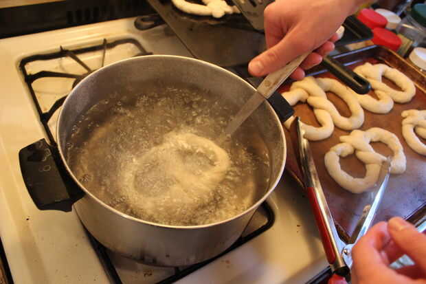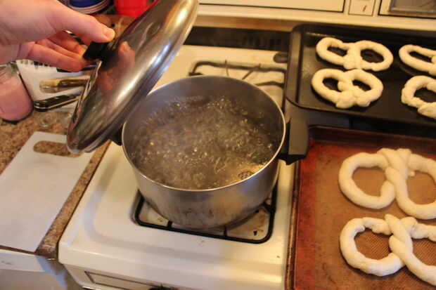 Cuando que termine de transformar todas las bolas de masa en forma de pretzel el agua debe han llegado a hervir. Si no espere hasta que el agua comience a hervir antes de hacer cualquier cosa. Una vez hirviendo, precalentar el horno a 450 grados Fahrenheit.