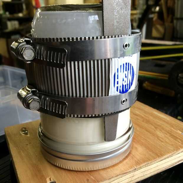 Siguiente voltear el frasco boca abajo. Coloque la sierra sawzall preparado contra el lado de la jarra. Ahora no meter ninguna banda de eje hacia abajo sobre la jarra y la cuchilla. Utilizar un controlador de tuerca para apretar el acoplamiento! REAL APRETADOS!