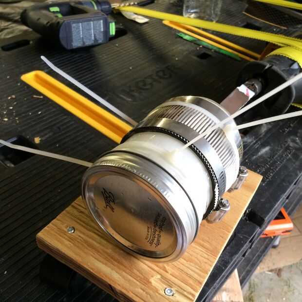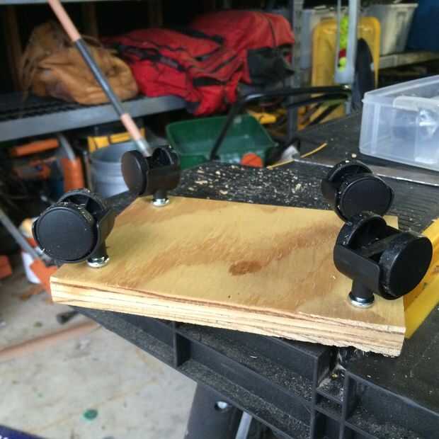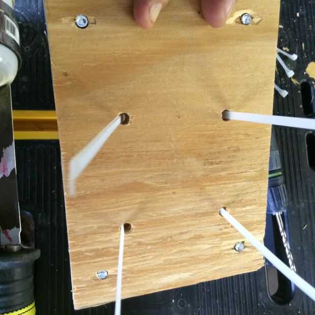 Corté un pedazo de madera contrachapada 1/2" de grosor 5"x 7". A continuación, perforé cuatro agujeros en las esquinas, a unas dos pulgadas de los bordes. Luego puse mi frasco encima de la madera contrachapada y exclusivamente cuatro agujeros más bajo el frasco, justo dentro de su perfil. Luego, inserté las rueditas en los agujeros de esquina, y las brindas de plástico en los agujeros interiores para sujetar el frasco.