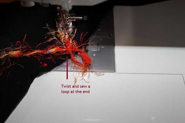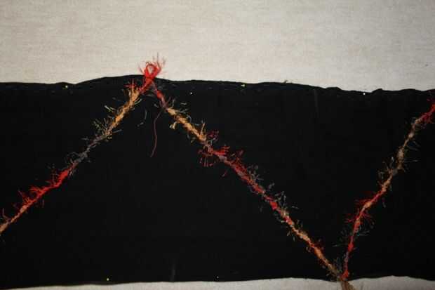 De un extremo de la esquina del mantón comenzó a coser el hilo en un cruce de caminos y hace un bucle donde marcada X y continuó con un corte el hilo hasta la cantidad deseada. Siga por favor las fotos, es fácil de entender.