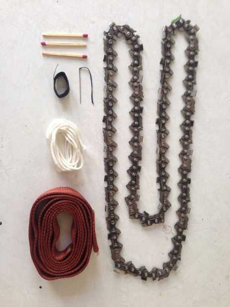 Para este proyecto que necesitarás una cadena para Sierra de cadena, un nylon de las correas, algunas encerado hilo lino algunos paracord o similares hilo de nylon, una aguja, una sierra para metales o sierra de banda y unos partidos.