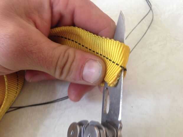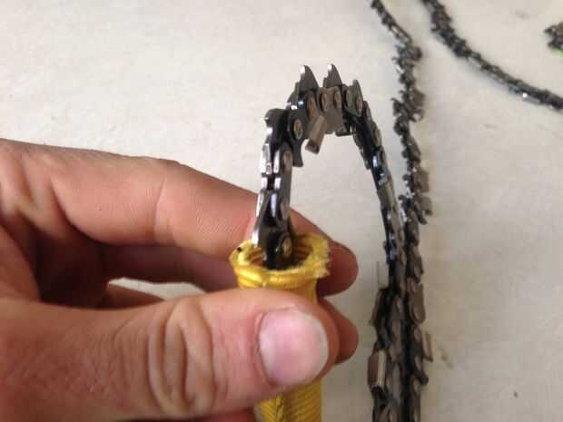 La mejor manera me pareció crear asas para la Sierra de cadena a utilizar algunos nylon tubo las correas. Estrella cortando un pedazo de 18 pulgadas de correas y de fusión de los extremos con un cerillo o encendedor evitar que se deshilache. A continuación, simplemente inserte el final de la cadena de cerca de 6 pulgadas en el extremo de la pieza de cinta.