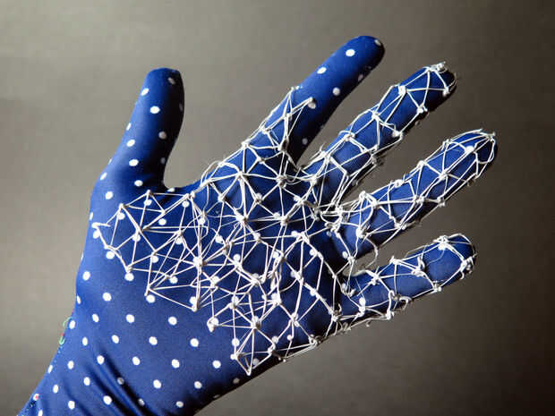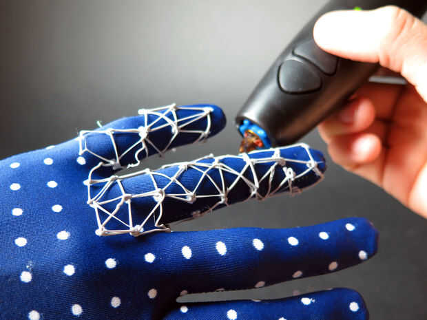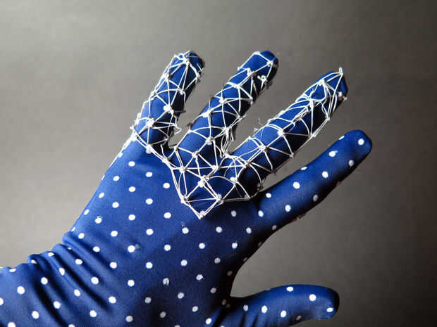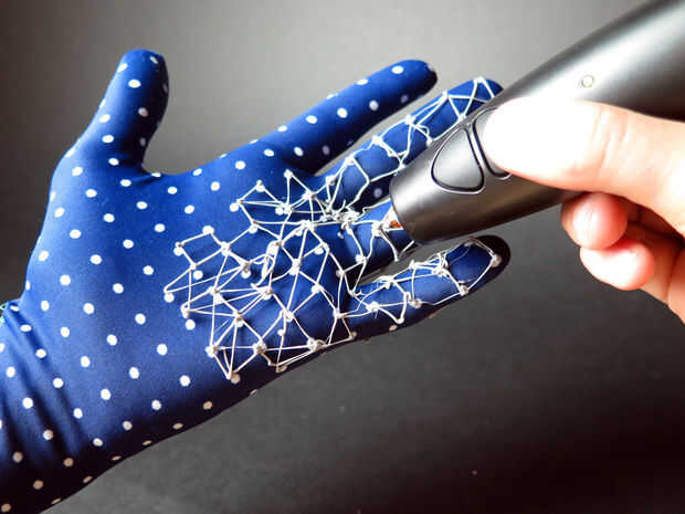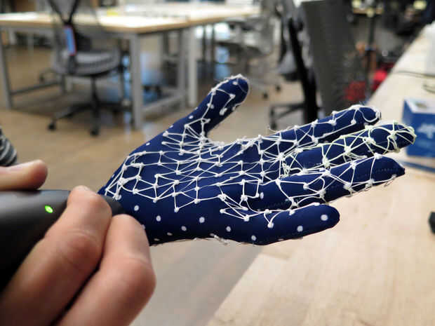 Colóquese el guante de la nube de puntos. Me puse el guante en mi mano izquierda para que podía usar mi mano derecha para sostener a la Doodler 3D. Recomiendo a partir de una posición que sea cómoda, sobre una superficie plana como la palma de su mano. También pueden tomar varios intentos para conseguir una sensación para el proceso antes de ir a mallado mano completa. Si no te gusta la malla que está generando, simplemente detener y eliminar cualquier malla no deseado.